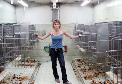 אליסון קרונין מציגה את הכלובים הריקים לאחר הפינוי (צילום: Monkey World)