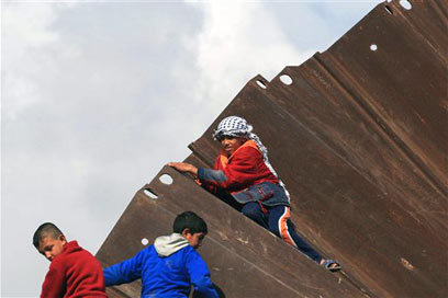 ילדים פלסטינים על הריסות החומה ברפיח (צילום: AP)