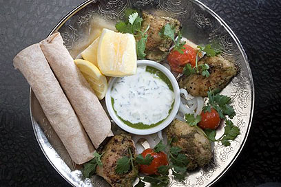 - הגשה: על צלחת הגשה או מגש מתכת גדול מפזרים בצורה דקורטיבית בצל פרוס, נתחי עוף צלויים, גבעולי כוסברה טריים ושלמים, ראיטה בכלי, פלח לימון והלחם השטוח.