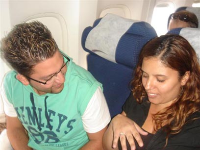 רותי וסער במטוס, עם טבעת האירוסים. זוגיות שהתחילה בזכות סרט