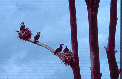 קורמורנים שחורים לבני צוואר על עץ בסמוך לאגם