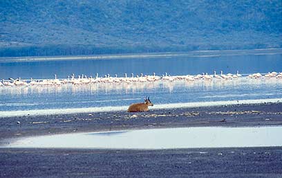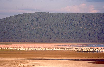 מראש מצוק הבבונים, הצופה מקרוב אל האגם, נראה הפס הוורוד לאורך החוף רוחש חיים ותנועה. מתוך המים עולה מעיין געייה המזכירה עדרי בקר וצאן הרועים באחו. ככל שמתקרבים מתגבר הרעש, והפס נפרד לרבבות נקודות בודדות של פלמינגו ורודי נוצות, בעלי רגליים אדומות ודקות, צוואר ארוך ומעוגל ומקור כהה. למעלה ממיליון עופות פלמינגו מתגוררים כמעט דרך קבע במי האגם הקטן, וכולם עסוקים במשך רוב שעות היום בפעולה האינסופית של סינון המזון מהמים.