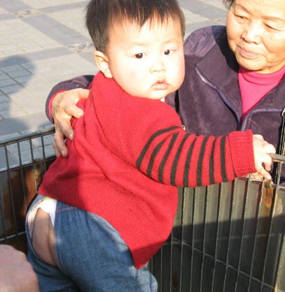תמונה שכיחה בסין היא של התינוקות חשופי הישבן. ההורים הסינים גוזרים חור במכנסי הילדים, ודרך התניה מלמדים אותם לעשות את צרכיהם כשההורה שורק חרש. אינני מסוגל שלא לתהות, אם אכנס לחדר ישיבות מכובד בסין ואשרוק חרש, סיני או שניים לא יוכלו לשלוט בעצמם. כאשר מטיילים ההורים עם הזאטוטים ברחוב, הם מדי פעם נעצרים בפינה שקטה, נותנים לילד להשתחרר, ותאמינו או לא – אף לא אדם אחד מסתכל ונגעל. חוץ מהזרים, כמובן.