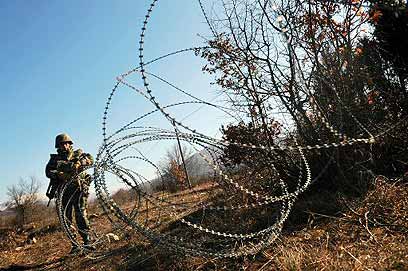 חיילי נאט"ו פורשים גדר תיל בקוסובו, הבוקר (צילום: AFP)