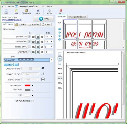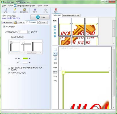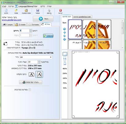 התוכנה החופשית Posteriza תסייע לכם להדפיס בנוחות ובמהירות, פוסטר בכל גודל שתרצו. המסמך הענק שלכם יחולק באופן מתואם לעמודים, אותם תדפיסו בנפרד ותחברו יחד כדי להגיע אל הגודל המלא. התוכנה אינה דורשת התקנה. היא רב-לשונית, כולל עברית וערבית.