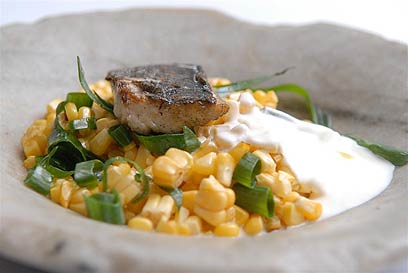השף חנן עזרן ממסעדת "לחם ארז" מגיש מנה של פילה בס על מצע של תירס מתקתק וקרם פרש. מרענן, בריא ואפילו קל להכנה