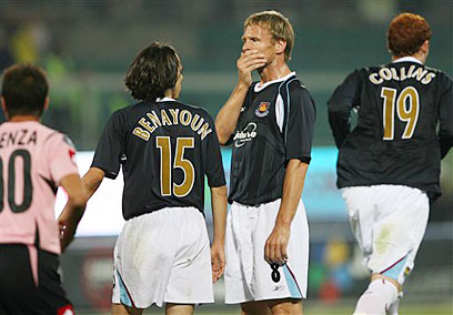 שרינגהאם עם החבר יוסי בניון במדי ווסטהאם אשתקד (איי.פי)