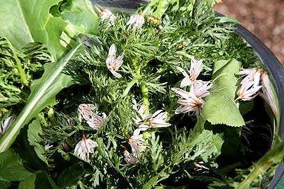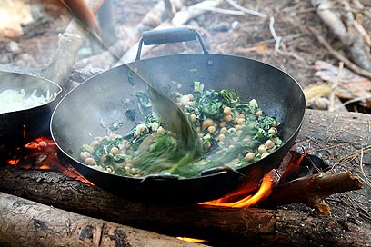 הכנו פיתות מקמח מלא עם אזוב טרי על הסאג', חביתות עם אספרגוס בר וחביתות עם שלל ירוקים מהשדה. טובה הכינה עלים ממולאים בעדשים ובורגול בסגנון תנ"כי. היו גם חומוסים מבושלים עם מרווה וחלמית, סלט ירוק גדול מהנבטים והירוקים שאספנו וסלט צנונית ולפת, שהיו מזונות מאוד פופולאריים בעולם העתיק על-פי דבריה של טובה. מובן ששתינו גם תה מהביל מצמחי התבלין עזי-הטעם. אמנם לנו היתה אש והיו סירים, אבל אם מתחשק לכם ללקט ולמעט בציוד – קחו קערת סלט, לימון ומבקבוקון עם מעט שמן-זית וצאו החוצה. לקטו לכם מהנבטים הנובטים עתה, מהעלים הצעירים של החלמית, השומר וחרדל הבר, לקטו את פרחי העירית היפיפיים והמתקתקים - ערבבו הכל בקערה עם מעט לימון ושמן זית – והרי לכם סעודה טעימה, טריה וחיונית.