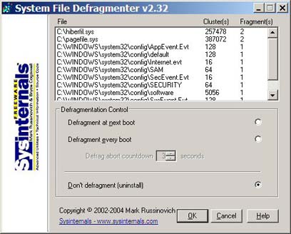 SysInternals כוללת שני כלי דפרגמנטציה שימושיים. הראשון, Contig, הוא כלי שמתבסס על מודול הדפרגמנטציה המובנה ב-Windows, בתוספת של כמה פונקציות ומתגים מתוחכמים שלא קיימים בכלי המקורי. הוא ניתן להפעלה רק משורת-הפקודה ולכן אינו ידידותי במיוחד, אבל הוא די יעיל.