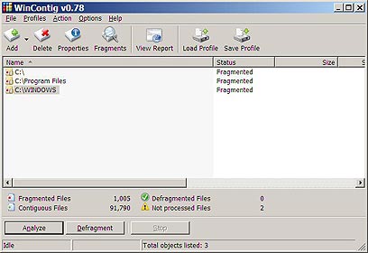 זוהי תוכנה חדשה יחסית, אבל די יעילה, זוכה לביקורות טובות והיא וחופשית לגמרי. WinContig, בדומה ל-Contig של SysInternal שהיוותה כנראה השראה לשמה, משמשת בעצם כממשק מתוחכם לכלי הדפרגמנטציה המובנה של Windows. זוהי תוכנה ניידת (Portable) שאינה דורשת התקנה, לא שותלת קבצים בתיקיות Windows ולא מבצעת רישומים ל-Registry. אפשר להשתמש בה משורת הפקודה או מממשק GUI נוח.