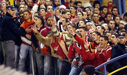 אוהדי בני סכנין. חלוקים ביציע באיצטדיון 'דוחא' (ראובן שוורץ)