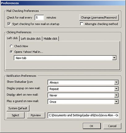 שוב, למשתמשי Firefox יש אפשרות בחירה נוספת: תוסף בשם Yahoo Notifier מציג עדכונים במסגרת חלון הדפדפן, והוא משוכלל יותר מהכלים הרשמיים. בין היתר אפשר להגדיר את תכיפות בדיקת העדכונים, ניתן לקבוע פתיחה של המייל החדש, בלשונית חדשה או קיימת, בלחיצה על אחד ממקשי העכבר לבחירתכם ועוד.