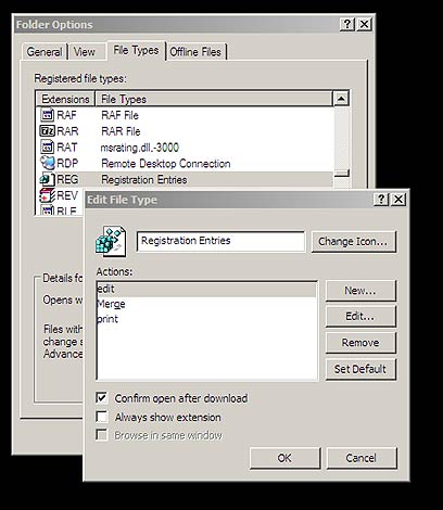גישה אחרת יכולה להיות עריכה של קובץ הרישום למניעת ייבוא שגוי, על ידי מציאת המפתח בשם HKEY_CLASSES_ROOT/regfile/shell ושינוי הערך שלו ל-edit. גישה שלישית ובטוחה יותר היא פתיחה של המחשב שלי, בחירת כלים, אפשרויות תיקיה, סוגי קבצים ובחירה של הרשומה לקבצי REG. הקלקה על מתקדם, בחירה ב-edit, ולחיצה על כפתור קבע כברירת מחדל.