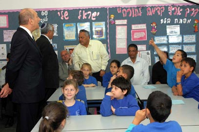 אולמרט משוחח עם התלמידים בבית הספר (צילום: אבי אוחיון, לע"מ)