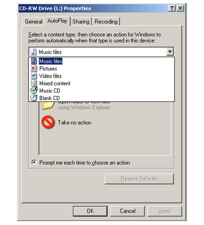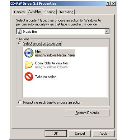 כדי לבטל את ההפעלה האוטומטית, יש לסמן את כפתור הרדיו התחתון, Prompt me each time to choose an action. כעת, בכל פעם שתכניסו את הדיסק, יופיע חלון שישאל אתכם אם לפתוח (ואם כן, באמצעות איזו תוכנה) את הקבצים, לצפות בספריות שעל הדיסק או להתעלם באלגנטיות.
