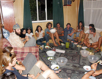 בעודם עסוקים בהכנות ובישולים לשבת, מצאתי לעצמי זמן להפריע להם בשאלות וזוטות כמו "כמה אנשים יכולים להיכנס לכאן בכלל? הרי הסלון לא יכול להכיל יותר מארבעים בני אדם, וגם זה אם הם יושבים אחד על השני?". אבל ישי, מערבב את השעועית עם התפוחי אדמה, מסביר שבשבתות פורשים שמיכות ומזרנים בגינה ואז אפשר לדחוס אפילו 100 מוצ'ילרים.