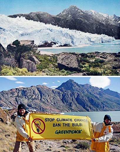 למעלה: קרחון ויידמה בפטגוניה בשנת 1930. למטה: פעילי "גרינפיס" באותה נקודה כיום (צילום: AFP)