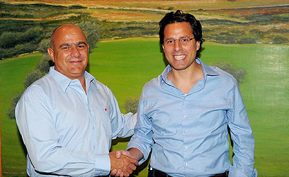 ג'רמי בלנק מקרן יורק (מימין) ודני דנקנר, יו"ר הפועלים (צילום: סיון פרג')