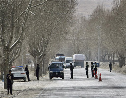 מחסום של משטרת סין בדרך לבירה להסה, היום (צילום: AP)