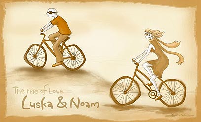לוסיה ונועם התחתנו לפני כשלושה חודשים בצוק בפלמחים, כשעל הזמנת החתונה התנוססו דמויותיהם כשהם רכובים על אופניים.