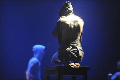 העבודה נפתחת בשורה של פנים שמפציעים מהחושך. כשהעיניים מתרגלות, מטפסים הגופות על כסאות עץ גבוהים, מסובבים את הגב לקהל וחושפים ברקוד מקועקע על גופם.
