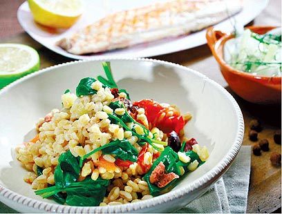 - על להבה גדולה מחממים מחבת פסים, משמנים את הדג, מתבלים במלח וצולים אותו כדקה וחצי מכל צד. מעבירים לצלחת הגשה לצד תבשיל החיטה ומגישים מיד עם פלחי לימון.