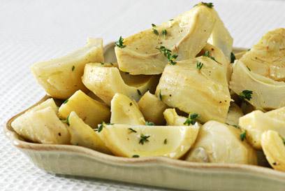 על אף שאני משוגעת על ארטישוקים טריים, אני מסרבת לפצוע את אצבעותיי בקילופם המייגע, כך שאני מסתפקת ברכישת תחתיות ארטישוק קפואות. החכמה היא לבשלן כך שיצאו טעימות: אני עושה זאת עם מיץ לימון, ענפי מרווה טריה ושמן זית. כיוון שתחתיות הארטישוק נוטות להשחיר קלות, כדאי לאחסנן בנוזלי הבישול עד קרוב ככל שניתן למועד ההגשה – ואז לסנן ולתבל.