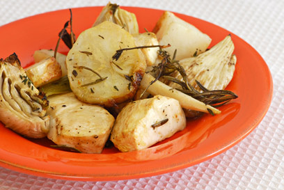 שורש סלרי הוא ירק נפלא, טעים במיוחד כשהוא נאפה בתנור. יחד עם תפוחי אדמה, שורש פטרוזיליה, שומר ועשבי תיבול התוצאה היא פשוט נפלאה. אם מכינים מבעוד מועד מאחסנים בקופסת פלסטיק סגורה היטב במקרר ומחממים בתנור בחום נמוך-בינוני (140-150 מעלות) לפני ההגשה.