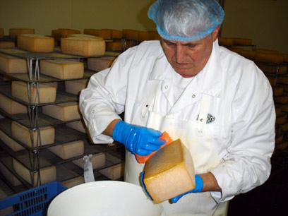 דחיסה ושטיפה במי מלח. ייצור גבינה קשה (צילום: שגיא קופר)