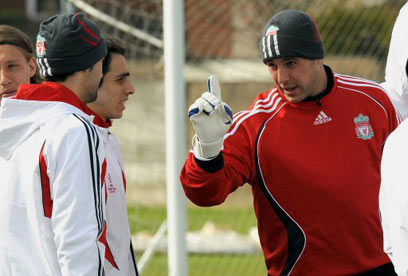 ריינה מעביר תדריך טקטי לבניון באימון ליברפול (צילום: AFP)