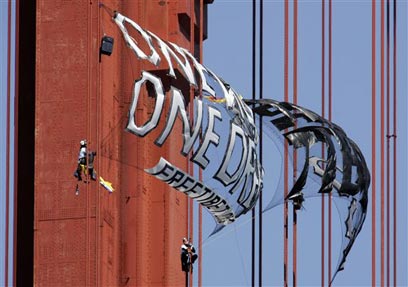 רמז לבאות? שלט פרו-טיבטי על גשר ה"גולדן גייט", אתמול (צילום: AP)