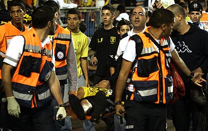 אוהד בית"ר פצוע מפונה מהמגרש (צילום: דודי ועקנין)