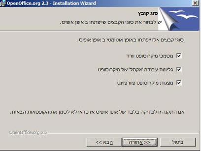 בתהליך ההתקנה, בחלון "סוג קובץ", תוכלו לבחור כי הקלקה על מסמכים במחשב תפתח אותם באמצעות OpenOffice. סמנו V במקומות הרלוונטיים והמשיכו להתקין כרגיל.