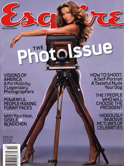 בהשראת ג'יזל כפי שצולמה לשער גיליון צילומים מיוחד למגזין הגברים "אסקווייר" (צילום: ג'יימס ווייט), כשאת גופה עוטה מצלמה בלבד, וכפי שצולמה עבור תעורכת הצילומים של צלם הסלבריטאים מריו טסטינו.