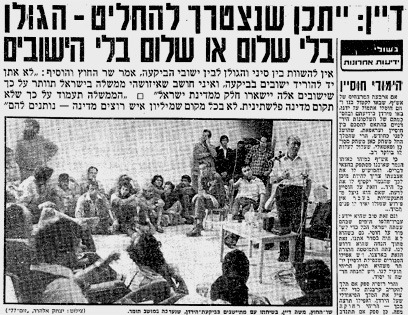 חמש שנים אחר כך, כשבתווך המהפך הגדול של 1977 ולאחריו הסכם השלום עם מצרים, העלה שר החוץ משה דיין את הסוגייה, כשאמר: "ייתכן שגם בגולן נעמוד בפני השאלה: האם להישאר עם ישובים ללא שלום, או להחליט על שלום בלי היישובים". אותו דיין צוטט מפי סגן ראש ממשלת מצרים, חסן תוהאמי כאומר: "ישראל תשלים עם פינוי הגולן תמורת שלום".