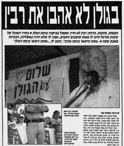 סוריה ליוזמת השלום של ארצות הברית ושלחה משלחת לוועידת השלום במדריד, אך הגולן עלה באופן רציני על השולחן רק עם עלייתו של יצחק רבין לשלטון, ב-1992. באחד מביקוריו הראשונים ברמה נתקל רבין במפגינים זועמים שאמרו לו: "אתה תישאר ברמת אביב, אנחנו נישאר פה".