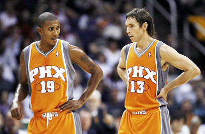סטיב נאש וראג'ה בל. במרחק הפסד מסוויפ לא צפוי (צילום: AP)