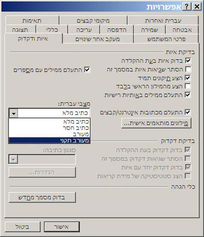 היכנסו לחלון כלים / אפשרויות והקליקו על הלשונית איות ודקדוק. בתפריט הנגלל מצבי עברית שנו את ההגדרה מ"כתיב מלא" ל"כתיב מעורב תקני".