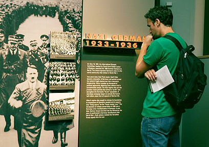 מבקר במוזיאון השואה האמריקני צופה בתמונת היטלר (צילום: AFP)