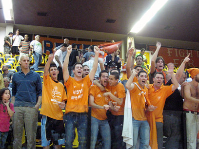 אוהדי מכבי ראשל"צ חוגגים הישרדות (צילום: עדי סרדס)