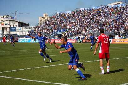 מגיבורי הניצחון. שמעון אבוחצירה חוגג על הפועל ר"ג (צילום: עוז מועלם)