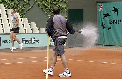 שראפובה מתאמנת, על רקע השקיית החימר בפריז (צילום: AP)