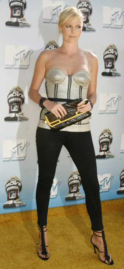 שרליז תרון כנראה מצטלמת עכשיו לאיזה סרט עלילתי-מלחמתי, כי אין הסבר אחר למה שהיא בחרה ללבוש. המכנס הצמוד שנראה כאילו היא כרגע סיימה שיעור ספינינג, הנעליים ששייכות לסרט רומאי-יווני, המחוך שמתעלל בחזה שלה וגם בכתפיים והתיק שבכלל לא מתאים בצבעים שלו. כל הקונסטרוקציה משווה לה מראה של מישהי עם גוף רחב וראש קטן. שרליז היקרה, את הרי אלופה בלבוש ותמיד מהממת. מה קרה?