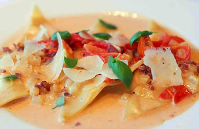 רביולי בטטה וגבינות ברוטב שרדונה, עגבניות וענבים