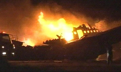 שברי המטוס עולים באש לאחר ההתרסקות בחרטום, הלילה (צילום: AFP)