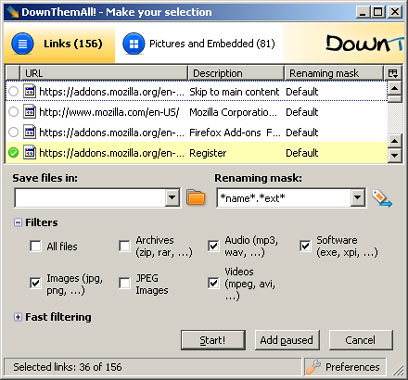9. DownThemAll - כלי שמוריד את כל הקבצים המקושרים באתר מסויים. אם אתם מאחסנים כמות גדולה של תמונות באתר מסויים, או סרטון וידאו ארוך שמחולק לכמה חלקים, לא תצטרכו לשמור כל אחד מהם בנפרד - טרחה לא קטנה כשמדובר, למשל, בקבצים ב-Rapidshare.