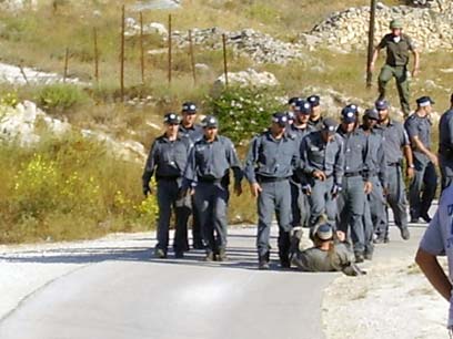 שוטרים מול מתנחל. הפינוי ביום חמישי (צילום: רעיה ליבמן)