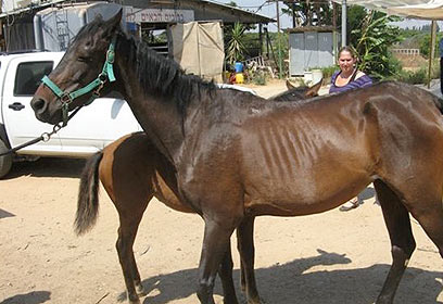 "אנחנו מטפלים במקרי התעללות רבים, אבל כשפתחנו את שערי האורווה לא יכולנו שלא להזדעזע מחומרת המצב", כך מתארת ד"ר צביה מילדנברג, רופאת סוסים בשירותים הווטרינרים, את מבצע ההצלה בו לקחה חלק השבוע. "במקום היו 18 סוסים, ביניהם כמה סייחות צעירות, אחת מהם בת שלושה ימים בלבד", היא מוסיפה. "כולם היו במצב של רזון מתקדם או קיצוני. פינינו שלדים מהלכים על ארבע - והיה לנו קשה לעכל את העובדה שבאורווה היו ערמות גדולות של חציר".