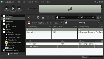 רוב תוכנות המדיה שמות דגש על וידאו ומציעות גם אודיו "על הדרך". אבל Songbird, שפותחה על-ידי פליטי Winamp ו-Yahoo Music Jukebox, כאן רק בגלל המוזיקה. מדובר במעיין שילוב בין דפדפן מעוצב ואלגנטי (יש גם סקינים) לתוכנה דמויית iTunes, שכוללת תחנות רדיו, רשימות השמעה (פלייליסטים), הורדת שירים ופודקאסטים באמצעות עדכוני RSS, היצע תוספים שעדיין נמצא בחיתולים, סימניות ועוד.