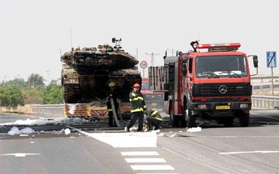 "שטח צבאי סגור" ובוער בכביש 6. מוביל טנקים ועליו טנק מרכבה עלה בשעות הצהריים (יום ה') באש בכביש חוצה ישראל, מתחת לגשר מחלף ניצני עוז. הטנק היה חמוש, ומחשש להתפוצצות התחמושת - נסגר הכביש לתנועה בשני הכיוונים.